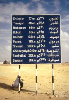 We stappen weer in en rijden verder. De temperatuur is inmiddels opgelopen tot een graadje of dertig. De airco gaat op mild. Door het woestijnlandschap gaan we richting Marmul. Daar raken we de draad kwijt. We komen terecht bij een PDO-kantoor. We mogen daar niet verder, er staat een slagboom voor. We vragen de weg aan de geüniformeerde man die ons tegenhoudt. Hij begint erg gewichtig te kijken, vertelt ons hoe we moeten rijden en tekent er een kaartje bij. Aan de hand van deze gegevens vervolgen wij onze weg. Ik vond dat de man al zo verdacht gewichtig deed. Er klopt niet veel van zijn informatie. We rijden richting kust over een gruwelijk hobbelige weg. We dreigen te verdwalen in de olievelden bij Marmul. Het weghalen van richtingaanwijzers schijnt hier folklore te zijn.