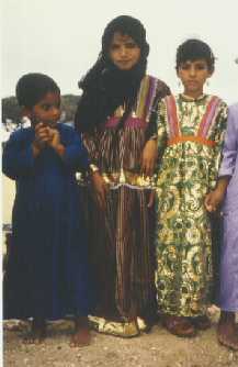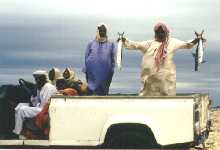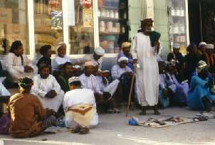 Als we verder rijden komen we bij een soort hoogvlakte, met (te veel) koeien en geiten. Het ziet er stoffig en armoedig uit. De traditionele bouwwijze is hier aan het verdwijnen: gestapelde stenen en rieten daken maken plaats voor beton en golfplaten. Er schijnt een goede reden voor te zijn. In de nieuwe materialen kunnen niet zo gemakkelijk slangen en dergelijke wegkruipen. In de middag rijden we naar Mirbat, een soort vissersplaats. Ook hier veel nieuwbouw. Ruud loopt over de markt terwijl ik de auto bewaak en me bezig houd met een stel zeer vrijpostige kinderen. Ik weet niet wat ze zeggen, maar af en toe worden ze door de ouderen tot de orde geroepen. Het zal dus wel niet veel fraais zijn. Mijn grote vriend is een jongetje van een jaar of vijf met een Amerikaans camouflagepakje aan. De broekspijpen zijn een paar keer omgeslagen. Hij ziet er in zijn overalletje heel anders uit dan de andere kinderen. Veel verzorgder. Hij doet ook niet mee aan de grappenmakerij maar blijft ernstig kijken terwijl ik hem in het Nederlands toespreek. Hij antwoordt gewoon in het Arabisch. Tot algemeen genoegen maakt Ruud een paar fotos. Het straatbeeld wordt, net als overal, bepaald door mannen.
