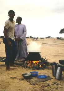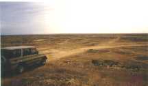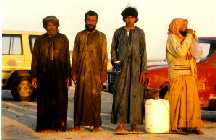 Een onrustige nacht. De tent klappert, af en toe regent het. Om 6 uur staan we op en breken de tent af. Langzaam rijden we langs de zandspit terug. Cross country gaan we naar El Khalid, voor water en eten. Water lukt wel, eten is wat moeilijker. Het is duidelijk te zien dat de ramadan is afgelopen, want er wordt openlijk gegeten en gerookt. We rijden over een grote vlakte met veel bomen en struiken. Bij een paar hutjes, in elkaar gezet van oud hout, is een kampvuur. Er staat een mannelijk gezelschap omheen. Het meest waarschijnlijke lijkt me opa, vader en zijn vijf zoontjes. We stoppen en ze gebaren dat we moeten komen. Er wordt in de richting van het huis geroepen. Het vrouwelijk deel van de familie verschijnt: oma, moeder en vier meisjes. Die zijn veel mooier gekleed dan de mannen. Ze zijn ook opgemaakt met zwarte stippen en gekleurde handpalmen. We krijgen een hand en ze bieden het bekende dadelprutje en koffie aan. De dadels zitten in een plastic bakje in een plastic zak. Als de plastic zak leeg is houden ze hem omhoog, de wind zorgt er verder voor. Afvalprobleem? Nee hoor. De nationale vlag van de bedoeïenen is een plastic zak boven in een struik.