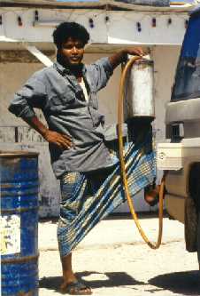 Een werknemer van de visfabriek komt langslopen en blijkt Engels te spreken. Hij is afkomstig uit de Filepijnen. Hij vertelt dat de vissers hun vis verkopen aan de visfabriek. Behalve wanneer er handelaren komen die meer bieden. Dan gaat de vangst daar naartoe. De visfabriek heeft eigen huisvesting. Er staat een grote schotelantenne bij. Onze kennis heeft op de televisie gezien dat er in Nederland een bijna-overstroming was. Het wordt zo langzamerhand tijd om onze terugvlucht te herbevestigen. Is er telefoon bij de visfabriek? Nee, niet nodig. De handelaren komen de vis toch wel ophalen. En als er wat gebeurt springt er iemand in de auto en rijdt naar Zaima, 250 kilometer hier vandaan. Daar is wel telefoon. We vragen of er een bank is om geld te wisselen. Nee, de dichtstbijzijnde bank is eveneens in Zaima. Maar als we dollars willen wisselen voor rials dan kan dat wel bij het Shell-benzinestation. De manager gaat binnenkort met vakantie naar Bangladesh, die wil wel dollars hebben. Ook de manager van de visfabriek schijnt wel eens dollars te willen wisselen. Die gaat geregeld naar Abu Dabi, een stad waar alles gebeurt wat Allah ten strengste verboden heeft. Terwijl we zo staan te praten komt er een blauwe Toyota pickup langs. Er zit een man in met een heel eigenaardig gezicht die ons doordringend aanstaart. Het lijkt wel of zijn gezicht verminkt is, verbrand of zo. Ik kan het niet goed zien want ik durf niet goed terug te staren. Hij wordt bijzonder vriendelijk gegroet. De burgemeester, mompelt onze zegsman. Zodra we weglopen rijdt de burgemeester - die echt een griezelig gezicht heeft - naar onze kennis en vraagt hem wat wij moesten. We horen nog net hoe de Filippijn ons geldprobleem begint uit te leggen.