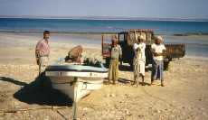 Met behulp van het woordenboekje proberen we een gesprek te voeren. Ze kunnen in ieder geval lezen, maar niet het Arabisch dat in Wat en hoe staat. Dat is kennelijk het verkeerde Arabisch. Helaas spreken ze maar weinig Engels. De oudste jongen, een echte puber, staat zich uit te sloven. He is crazy, zegt zijn vader. De kleine jongens doen hun mond niet open. Bedeesd en wellicht ook hongerig staren ze naar de kookpot op het vuur. Er zit een pas geslachte geit in. Ze roeren in de borrelende pot met een balk. Eerst hebben we het idee dat we mee moeten eten, maar dat slaat natuurlijk nergens op. Volgens mij is die geit voor zon groot gezelschap toch al een hapje van niets. Binnen hoor ik een baby huilen. Minstens tien kinderen. Dat lijkt me verschrikkelijk veel. De man is visser. Waarom woont hij zo ver, ik denkt toch wel drie kilometer, van zee af? Is het te gevaarlijk om er dichterbij te wonen? Is dit het goedkoopst? Volgens Ruud is het vanwege de geiten. Die hebben dicht bij zee niets te eten. We nemen afscheid van de familie. Als herinnering aan het bezoek van twee Nederlandse toeristen geven we een Delfts Blauw klompje. We sommeren de oudste jongen het aan zijn moeder te geven. Hij rent weg. Ik zou wel in het hutje willen kijken. De oudste jongen ziet nog kans een blikje Mountain Dew van de achterbank te grissen. We geven het tweede blikje ook maar weg. We gaan richting grote weg. Het pad dat we volgen loopt van hutje naar hutje. Er zijn veel zijpaden. Met behulp van de GPS vinden we de graded road.