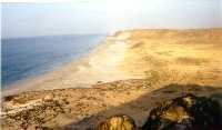 Daarna: weer eten kopen in een dorp. Ook hier weer veel kinderen op straat. Het zijn schatjes, maar wel vieze. De mensen in dit dorp zien er donkerder uit dan elders. We rijden via Muscat naar het oosten. We willen naar het strand! Gelukkig hebben we een boekje bij ons waarin staat welk zijstraatje we precies moeten hebben, anders hadden we het nooit gevonden. Het is een mooie rit er naartoe. De weg begint met asfalt, maar in de buurt van Yiti gaat hij over op steenslag. We komen uit bij Bandar Khayran. We vinden pas na enig zoeken het pad naar een mooie inham. We rijden eerst te ver door. We draaien om. Er staat een lifter en we besluiten em mee te nemen. Zijn bagage bestaat uit een grote zak. Ik kruip achterin, hij mag voorin. Wil ons een sigaretje aanbieden. Ruud maakt hem duidelijk dat wij niet roken en dat wij het op prijs zouden stellen als hij dat ook niet deed. De sigaretten gaan weg. We laten hem een kaartje in het boek zien en vragen of hij het zijpad weet. Er komt een erg vaag antwoord. Bij elk zijpad zegt hij: nee, niet hier, verderop. Bij het volgende dorp weten we zeker dat we te ver zijn. We zeggen dat we weer terug gaan. De man stapt uit en loopt niet verder langs de weg maar naar het dorp. Hoeft hij niet verder? Is hij een rondreizende waarzegger of zoiets?