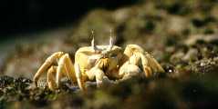Ik zit op het strand. Ruud is gaan snorkelen. Net was er een invasie van circa tien autos met westers volk, maar die zijn weer weg. Dit strand is van mij! En van de krabben. Nu de rust is weergekeerd komen ze overal tevoorschijn. Het is heerlijk weer. De zon schijnt en er staat een lekker windje. We hebben ons hele hebben en houden te drogen gelegd. Alles was klam geworden.