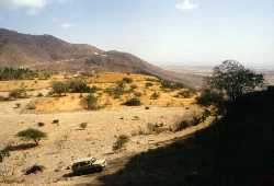Op het getekende kaartje staat dat de weg naar de Wadi alleen geschikt is voor 4WDs, dus dat is al gauw een uitdaging. Overigens klopt de aanduiding wel. De weg gaat eerst steil om hoog en dan weer even steil omlaag, over een uitloper van de bergen heen. Als de weg weer vlak wordt stoppen we even om de omgeving in ogenschouw te nemen. Zon honderd meter naar rechts zien we een huisje met mensen erbij. Er komt een vrouw aanstuiven die iets roept dat we niet kunnen verstaan, maar waarvan de strekking duidelijk is: wegwezen. We rijden verder. Er loopt ook een man rond met geelachtig kroeshaar. Hij lijkt meer op een Australische aboriginal dan op een Arabier. Hij groet ons vriendelijk. Op de foto wil hij niet.Zoals op zoveel plaatsen waar relatief veel regen valt en dus veel groeit, is Wadi Darbat erg overbegraasd. Bij de rand van de vlakte zijn proefvelden aangelegd. Waar geen begrazing is, staat anderhalve meter hoog gras. Als er wel begrazing is zijn de bomen armetierig en is het gras tot op de wortels afgekauwd.