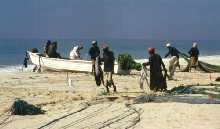 Het is aardig afgekoeld vannacht. De tent is nat van het condens en van de dauw. Aan het strand bij de visfabriek kijken we hoe de vissers uitvaren. Ze slepen hun boot met een rode vissers-Toyota-pickup naar de zee en duwen hem dan met de auto het water in. Drie mannen zijn er druk mee doende. Het gewone verhaal: handen schudden, praatje maken. Ze vissen met staande netten. Niet erg lang, misschien 50 meter. Ze gaan alleen of met zn tweeën het water op.