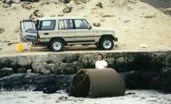 We maken de spectaculaire afdaling naar het dorp Saqirah. Een dorp met twee gezichten. Aan de ene kant vervallen oude huizen van gestapelde stenen. Aan de andere kant nieuwe huizen (sjabloon vissersdorp). De mensen hier zijn heel donker en de vrouwen niet gesluierd. Het is er een rotzooi. Ze hebben geen concept van afval. Later vertelt iemand ons dat ze hun nieuwe huizen net als de oude inrichten. Het vee staat binnen, zelf slapen ze erbij op de grond. Jammer dat we de taal niet spreken. We zouden wel wat meer van ze willen weten. We vinden in Saqirah geen kampeerplaats die ver genoeg van de bewoonde wereld ligt. We besluiten nog een stukje verder te rijden, hoewel het al laat is. Na een paar kilometer gaan we van de weg af. We rijden tot aan de kust. Vlak achter de eerste duinen zetten we de tent op. Het is hier mooi. Er staan bomen en struiken. Het waait alweer hard. We gaan achter een duintje uit de wind zitten en stoken de brander op. Met gewone benzine. We zien wel of het gaat. Uit de etenstas komen twee blikken met chili. We maken ze open en doen het eten in de pan. In een mum van tijd is het warm. Het is al een paar dagen geleden dat we warm hebben gegeten.