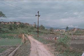 | People working in the heavy polluted river. The Microtrix worms, that had grown during the rainy season now tried to escape from the water that got more concentrate after the monsoon | A path from the main road leading to Thimi (on the hill in the background. The "stream" on the left contained "water" flowing from the fields with open defecation ("shitting fields") |